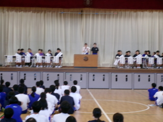 本日(9/17)新人体育大会の壮行会が行われました。2年生が中心になって行われる最初の大きな大会になります。これまで支えてくれた3年生を前に、各部から力強い決意表明がありました。新人大会は、19日(金)の特設部(水泳)を皮切りに始まります。生徒たちの活躍が今から楽しみです。 |