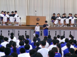 2学期が始まりました。始業式では各学年の代表生徒が力強く今学期の目標を発表しました。また、その前後に、この夏、全国・関東大会に出場した部活動(弓道部、陸上部、卓球部、特設・水泳部、特設・新体操部、ホッケー部)の表彰や報告会、平和大使として広島を訪れた3名の生徒による発表もありました。 |