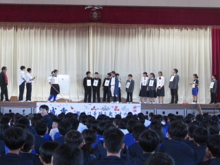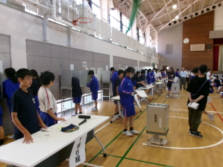 本日(9/30)生徒会本部役員選挙・立会演説会がありました。12人の生徒が立候補し、ここまで選挙活動をしてきました。その集大成として、全校生徒の前で熱い想いを述べ、最後のアピールをしました。また、選挙は村の選挙管理委員会の協力を得て、実際に使用している記載台や投票箱を借りて行いました。スムーズな選挙の運営に本校の選挙管理委員が活躍しました。 |