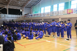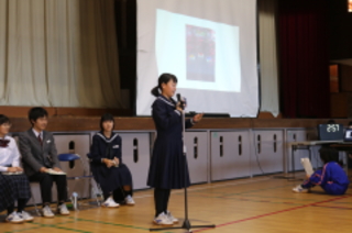 4日(火)の読書集会では、ビブリオバトルの決勝戦を行い、全校生徒による投票でチャンプ本を決めました。さらに、全校生徒と教員による谷川俊太郎の「子どもたちの遺言」の詩の群読を行いました。本の素晴らしさを十分に味わうことができた集会になりました。 |