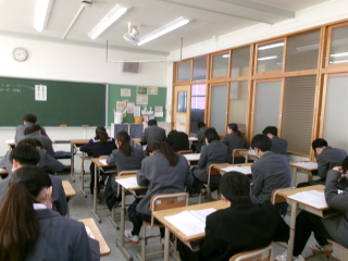 本日15日(水)より、1・2年生は県学力診断のためのテストを行っています。1日目の今日は国語・理科、明日は英語・数学・社会を予定しています。これまでの学習の成果を発揮しようと、真剣に取り組んでいました。また、3年生は私立高校の一般入試が本格的に始まりました。多くの生徒が受験に臨みました。 |