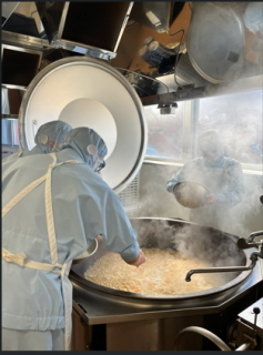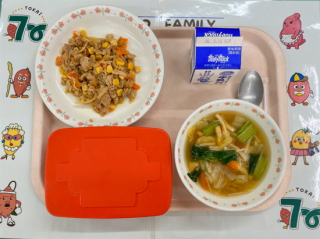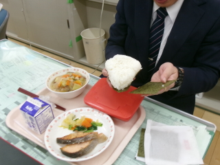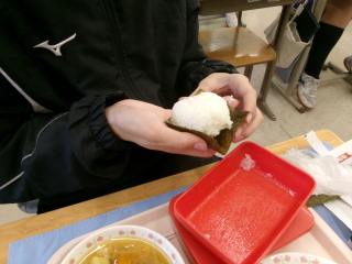 本日(1/27)の給食の献立は、村の70周年を記念した「海苔」を使ったおにぎり給食でした。生徒たちはそれぞれ鮭を具に入れたり、大きさや形にこだわったりと、自分で作ったおにぎりの味を楽しみました。先生たちも生徒とともに挑戦しました。また、「イモゾー汁」もおにぎりの味を引き立てました。 |