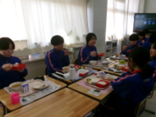 29日(木)は、1・2年生の第3回定期テストが行われました。今年度、最後の定期テストになりますが、これまでの学習の成果を十分に発揮できることを期待しています。また、全国学校給食週間にちなんで、本日の給食で「すいとん」が提供されました。生徒たちに美味しく食べてもらおうと調理員さんたちもがんばっています。 |