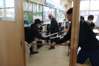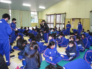 27日(火)警察署のスクールサポーターの方の協力を得て、不審者対応の避難訓練を行いました。侵入があったクラスは1次避難を行い、それ以外のクラスは侵入経路を塞ぎ、教職員がさすまたで対応する様子を映像で見ました。安全確認後、体育館でスクールサポーターから不審者に遭遇した時の注意点などの話を聞きました。その後、警察の方々と生徒会の2年生役員で座談会を行い、日頃感じている疑問について質問しました。 |